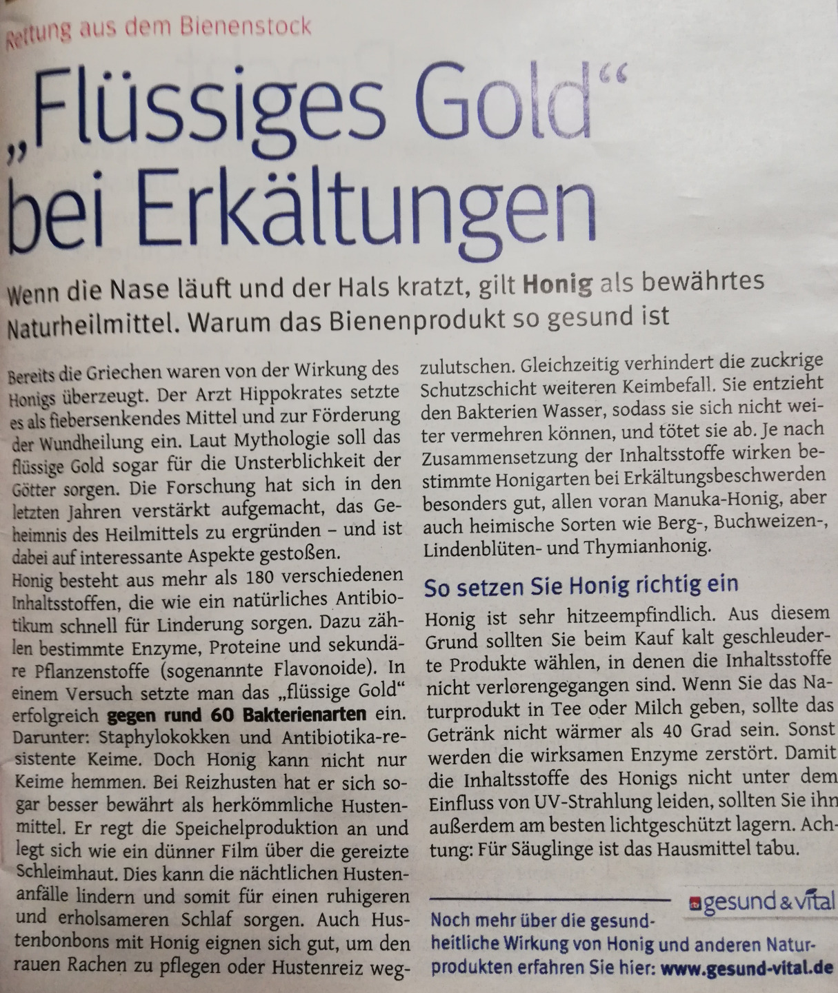 Für die Haut ist Honig gesund, da er Hautkrankheiten wie Schuppenflechte, Hämorrhoiden und Herpesbläschen heilen kann. Zudem wirkt Honig antibakteriell, antientzündlich und kann bei Verbrennungen und Wunden Abhilfe schaffen.
